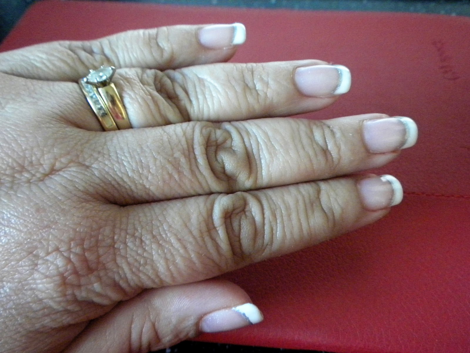 So, the worker finally finishes removing the old polish and starts doing the new. I'm cool. I'm calm. They fill in a small crack on my right ring finger nail with super glue. They do all the gel, the polish, a thin silver glitter line, top coat, done. It looks great, I pay, and I go home. One week later, it looks like this...fine still, although I'm not liking the silver glitter lines anymore, they look just gray now...but, all in all they still look good.