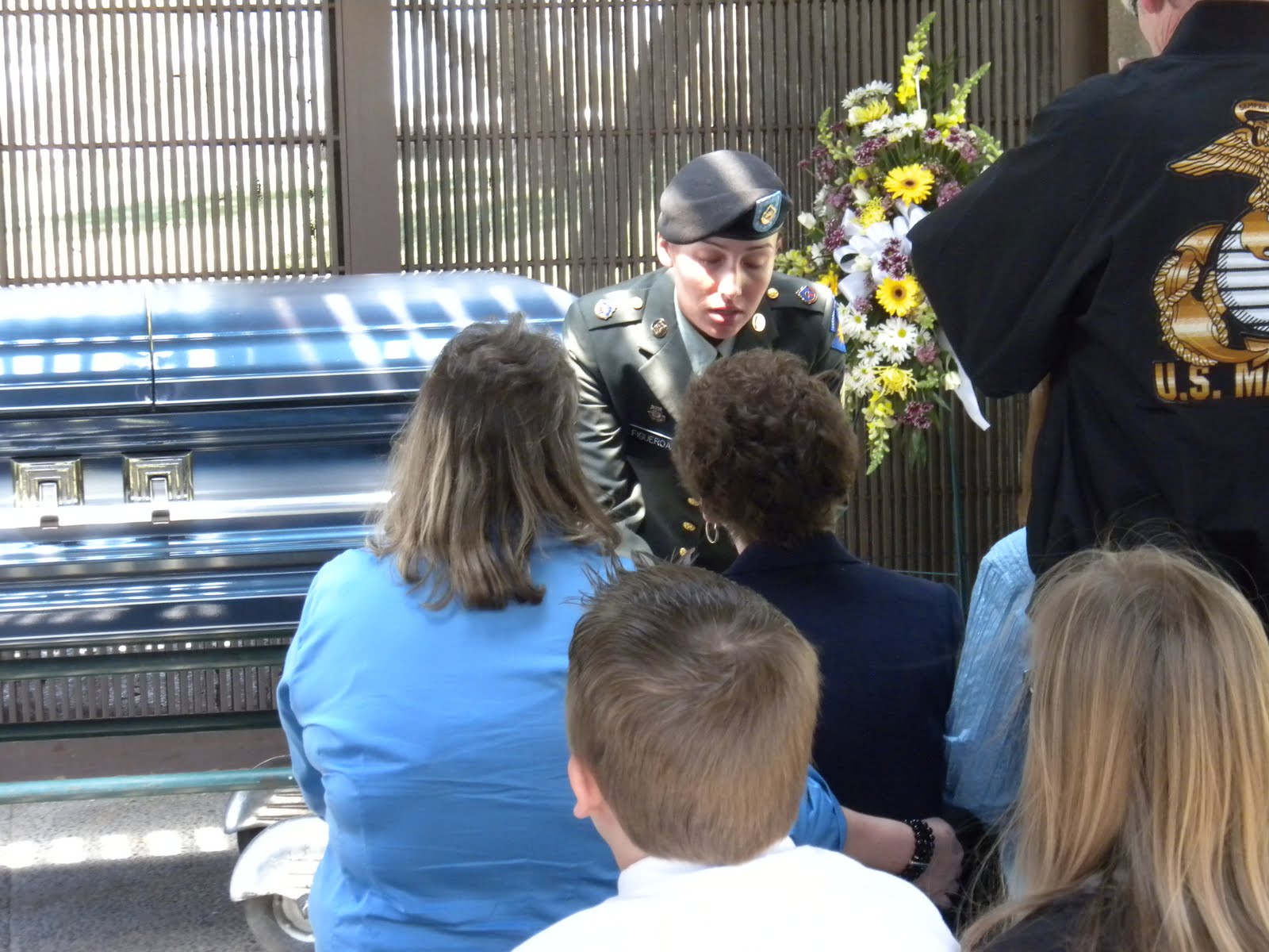 As Uncle Bob's casket was taken out of the hearse, there was a military presence by its side immediately. It was sad watching David and Russell pull their father's casket along. I remember watching my brothers do the same thing for my mom. Terry and Neil (Sherry and Shelly's husbands) were next and then Larry and Nick (Wendy's husband and son) were last. The flag on top pulled at my heart as I realized that when my own dad passes away, he will have one on top of his casket as well. The next part was so very touching. This young woman stood stoically at the head of the casket. No emotion showing on the outside. Just formality. Here was a former servant of our country being honored by a current servant of our country.