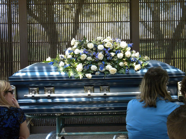Finally, the flowers were placed on top of the casket. I never knew that Uncle Bob's favorite color was blue. This casket was truly beautiful. The flowers on top were very flattering to the whole picture. I was glad I wore blue this day too, even though I didn't know about it.